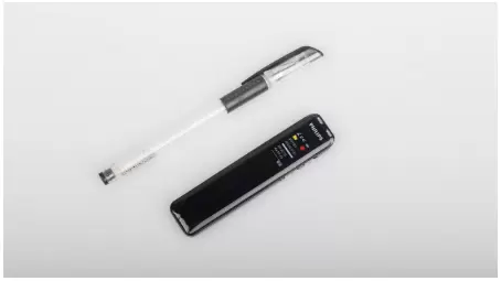 不磨叽,直接上产品,飞利浦这款AI录音笔机身小巧程度震惊小编了,便携度不亚于日常中性笔,大小尺寸为105*23*10mm,机身重34g。外边采用黑色钢琴烤漆设计,双镜面+合金轻盈框设计,静美又有质感。