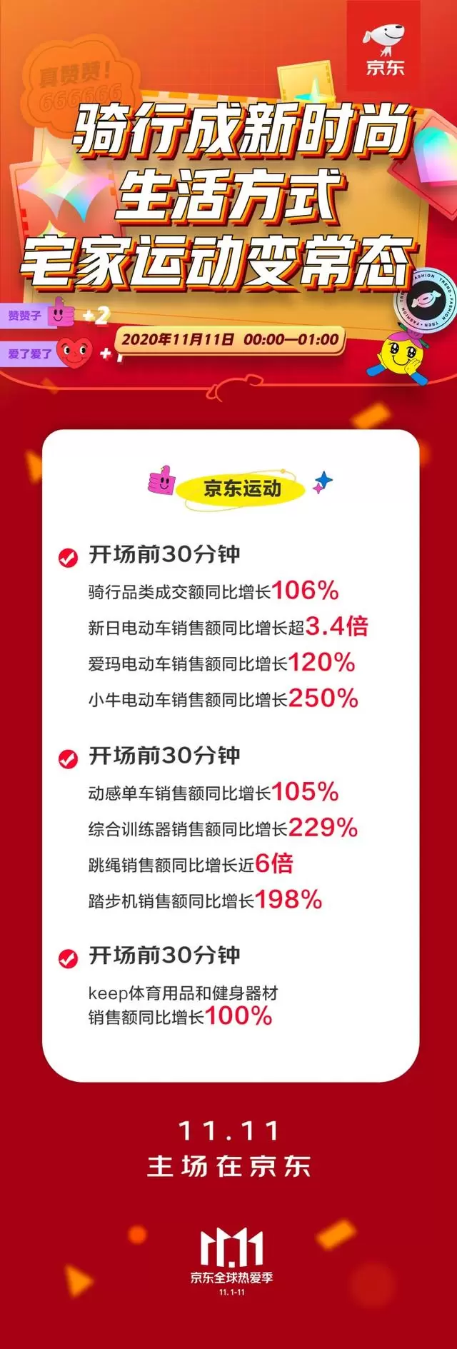 快节奏的生活方式让人们对拥堵的交通失去耐心,便捷、安全、环保的出行方式成为人们追求的目标。11月11日前30分钟,京东运动骑行品类同比增长150%,骑行作为一种新时尚生活方式影响力不断扩大。立冬后逐渐下降的气温没有冷却人们的健身热情,11日前30分钟,KEEP体育用品和健身器材销售额同比增长达100%;动感单车、综合训练器等大型器械及跳绳、踏步机等小型健身器材均受到消费者欢迎。