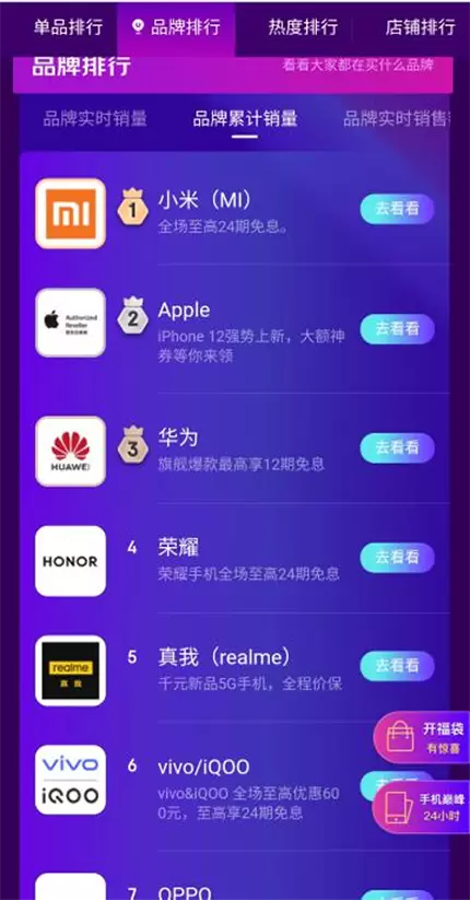 累计销售额排行榜中,Apple凭借iPhone 12强势上新率先摘得头筹,华为和小米同样实力不俗,斩获二、三名。