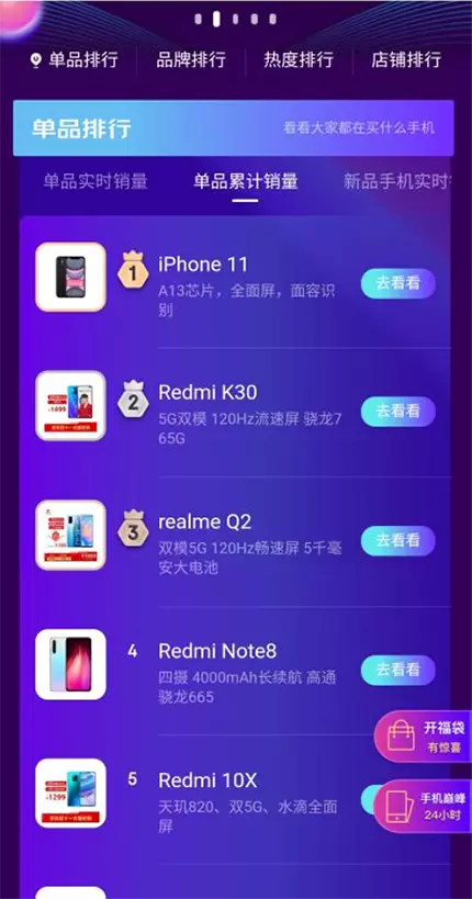 值得一提的是,在单品实时销量和累计销量的排行中,Apple上代产品iPhone 11傲视群雄,霸踞两榜首位,红米K30无奈屈居亚军位置,而红米9A和真我Q2分获实时和累计的第三名。