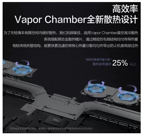 从散热方面来说,联想Y9000X搭载了四风扇的散热系统,提供了更大的排风量,这套系统也被官方称之为Vapor Chamber超薄真空液冷散热器,搭配铜合金散热鳍片,相较同厚度热管方案散热效率提高25%,这种散热方式明显优于传统散热方式。