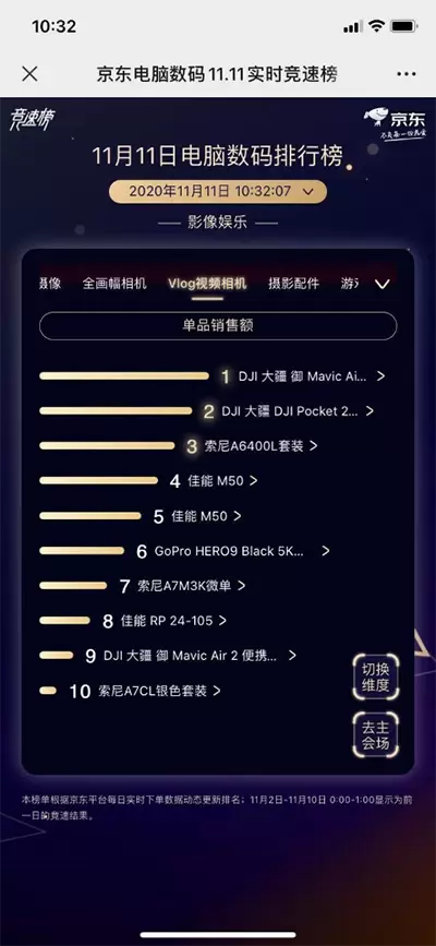 随着零点钟声的敲响,2020京东11.11全球热爱季终局之战全面爆发。11月1日00:00至11月11日00:09,京东11.11全球热爱季累计下单金额突破2000亿元,作为消费者购买3C家电的首选平台,同时也是品牌商的最大增量场,京东电脑数码品类销量再创新高,尤其是品质消费升级加速影像娱乐设备升级换代,佳能、索尼、尼康、大疆等品牌销量强劲增长。目前,京东电脑数码巅峰24小时热火朝天,各大品牌加足马力进入最后冲刺阶段,京东11.11电脑数码竞速榜排行即将见分晓。
