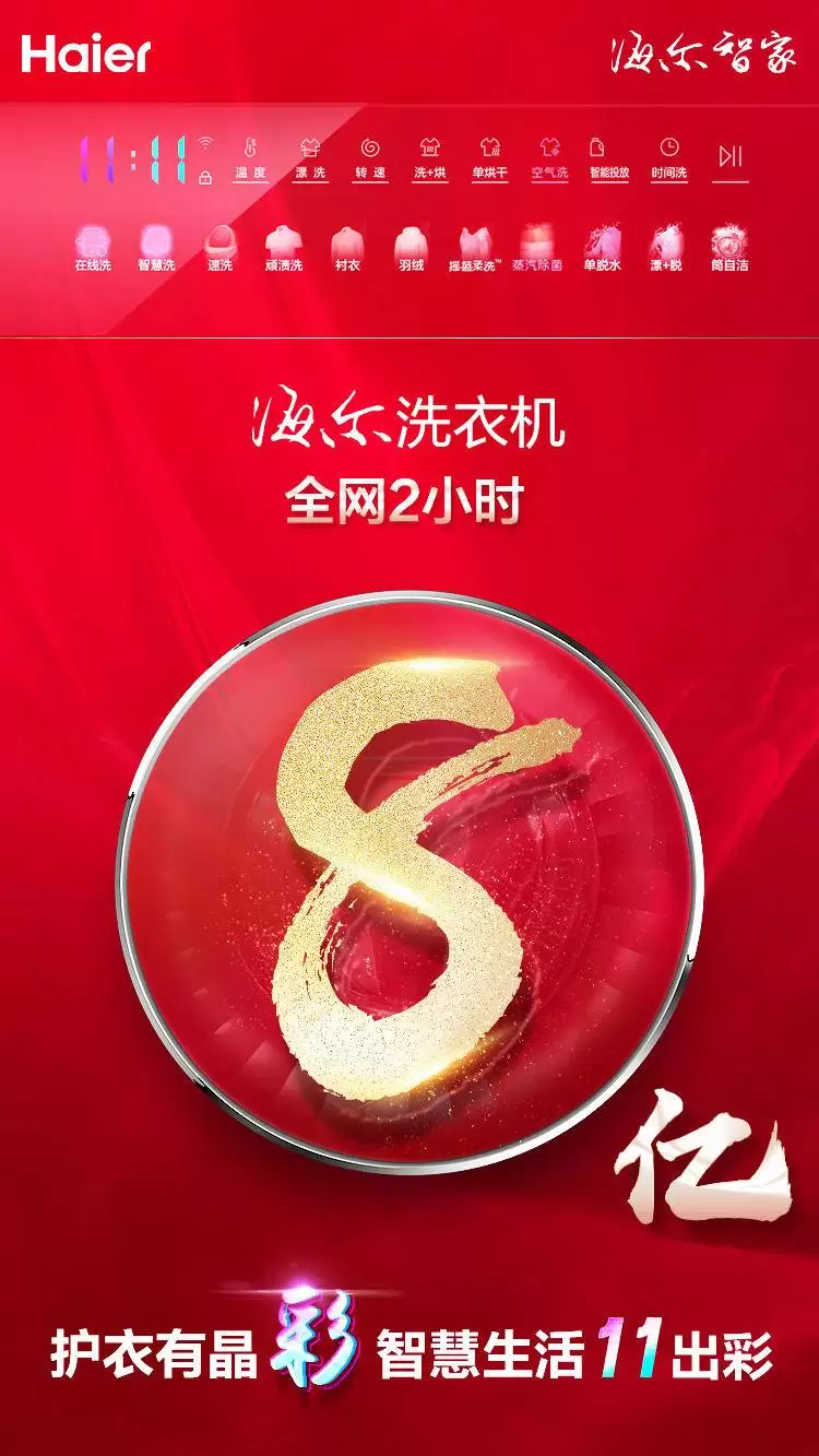 海尔洗衣机双11战报:2小时破8亿!居全网第一