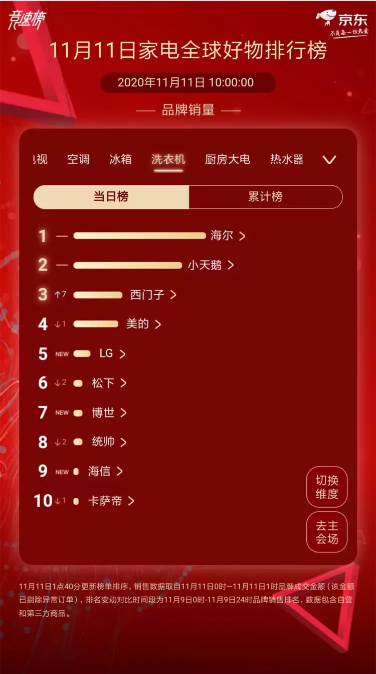 再看京东双11竞速榜,截至11月11日上午10点,海尔洗衣机稳居品牌销量榜榜首,同时与第二、三名拉开差距。不仅如此,10公斤洗烘一体机还入选京东潮电热卖榜榜单,成为洗衣机品类的第一畅销产品。