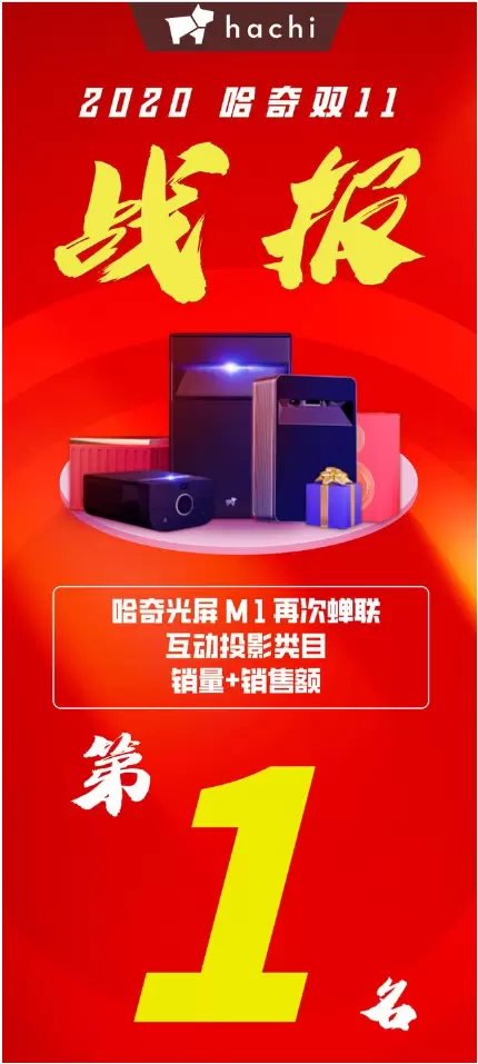 hachi哈奇智能双11战报:哈奇光屏M1霸榜,蝉联互动投影类目第一名
