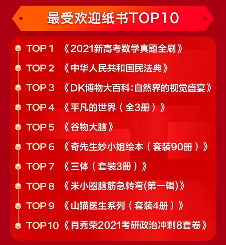 那么,哪些纸书最受读者关注?京东图书11.11最受欢迎纸书TOP10榜单揭晓,包括《2021新高考数学真题全刷》《中华人民共和国民法典》《DK博物大百科:自然界的视觉盛宴》等在内的10本书全面领航。