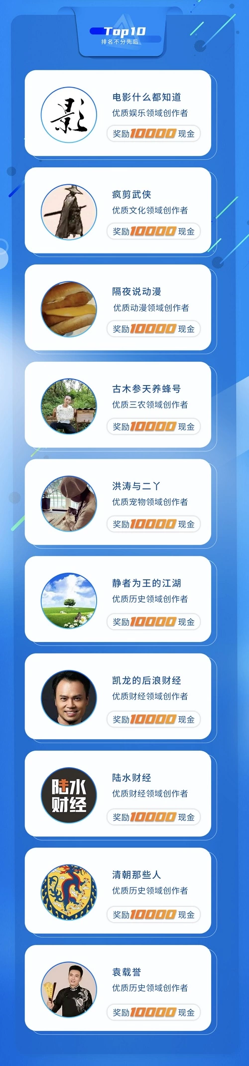 同时,根据参与创作者的创作情况,百家号也综合评选出了首期活动荣获一等奖的10位优秀作者,他们分别是:电影什么都知道、疯剪武侠、隔夜说动漫、古木参天养蜂号、洪涛与二丫、静者为王的江湖、凯龙的后浪财经、陆水财经、清朝那些人、袁载誉。据了解,这10位创作者每人将获得1万元的创作奖金。