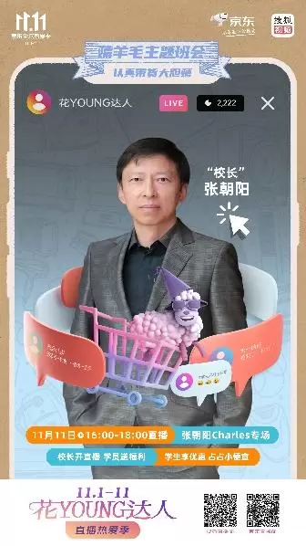 11月11日,搜狐视频双十一时期展现直播新玩法,联合京东校园打造的"花YOUNG达人直播热爱季"迎来"张朝阳Charles专场",以"薅羊毛课堂"的全新概念进行直播带货。