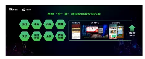 这次爱奇艺奇麟的全新生态布局聚焦于游戏、电商、教育、网服、文学、网络影视、金融、加盟招商等8大行业提供针对性的解决方案。譬如面对电商行业推出基于平台特性的互动广告,针对自营电商推出奇甄平台。另外爱奇艺奇麟还针对游戏行业,把在线云游戏、互动作为重点方向突破,也取得不错的成绩。