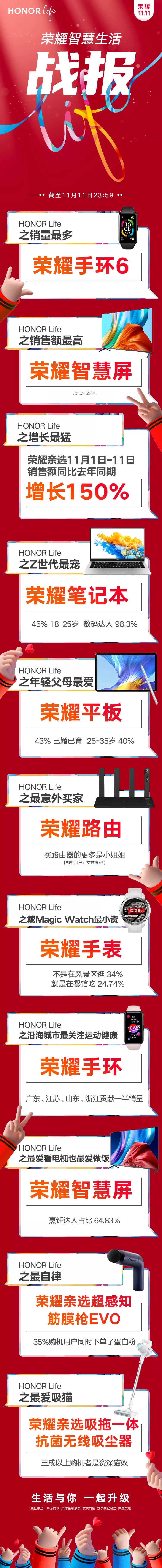 由此可见,荣耀智慧生活产品中不论是荣耀手环6、荣耀手表2等穿戴产品,还是笔记本、平板、智慧屏等产品的销售战绩在此次双11大战中都表现的相当出色。