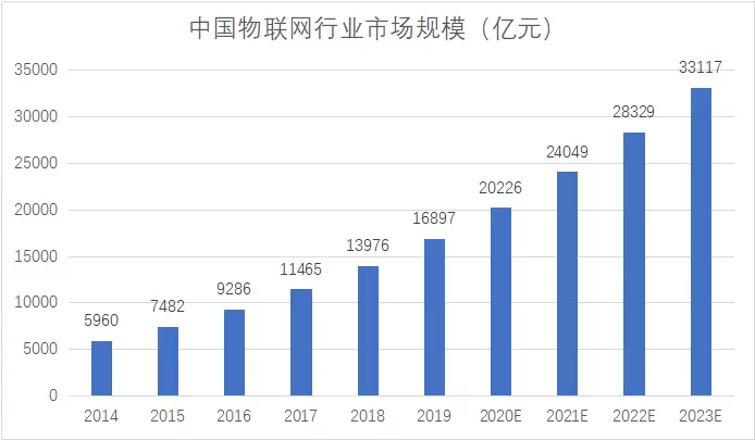 据沙利文数据显示,中国物联网行业市场规模在2019年达到了16897亿元,过去5年的复合增长率 23.17%。