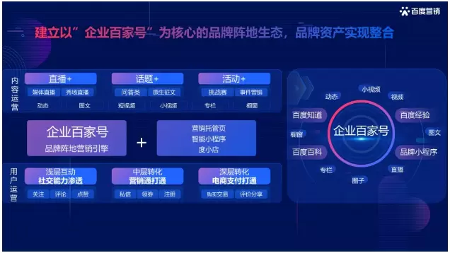 据悉,百度已经完整地建立了以号为核心的品牌阵地生态,经过一年的发展已经搭建了完善的阵地经营模式。首先,通过号+托管页、小程序、度小店的协同效应,在企业百家号内形成完整的内容运营模式,联动内容载体的丰富、多样的内容玩法进行驱动;同时,通过用户运营体系和组件能力的提升,形成更多触点的商机转化能力。