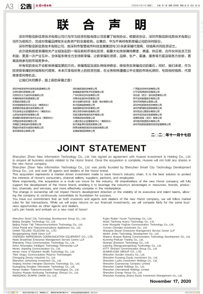 声明还称,所有权的变化不会影响荣耀发展的方向,荣耀高层及团队将保持稳定。投资新荣耀的经销商和代理商也承诺,未来只享有财务上的投资回报,在业务侧将遵循公平交易的市场化原则,与其他经销商、代理商享受同等机会。