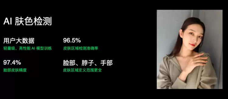 OFL肤质优化算法能分别对肤色和肤质进行AI处理,拍摄时帮助用户去掉脸部瑕疵、优化皮肤表现、让整体气色更出众。这套算法可实现96.5%的皮肤区域的分割,面部皮肤精度达到了97.4%。“肤色检测”范围不仅包括脸部皮肤,也包括脖子和手部的皮肤,几乎涵盖在拍摄人像视频时会露出的所有皮肤区域。