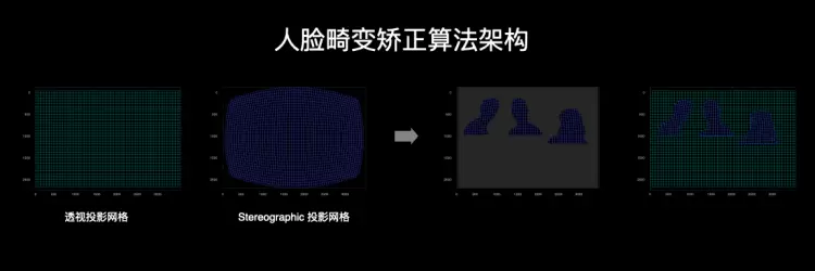 人脸畸变矫正在处理人脸畸变时,取透视投影中的背景部分,同时对人脸区域进行切割分离、再做一次球面投影,让人脸保持正常的、符合人眼观看习惯的形状,最终将两个画面叠加,从而得到人脸和背景都正常的画面,让整体效果更自然、真实。