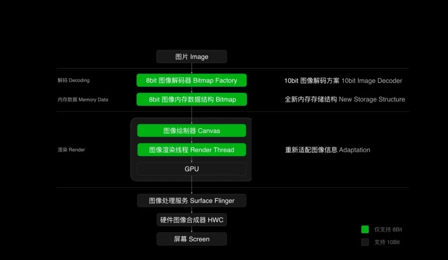 此外,OPPO全链路色彩管理系统对原生8bit图像解码器进行重构,研发出兼容10bit图像的解码方案。同时还对原生内存数据进行改造,适配10bit图像数据的存储结构,全面打通解码环节对于10bit图像信息的支持。