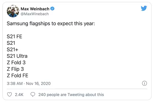 近日,Max Weinbach也在Twitter上分享了一份2021年三星旗舰产品的规划名单,其中Note系列榜上无名,除了传统的Galaxy S21系列外,取Note系列而代之的是Z系列,包括了Z Fold 3、Z Flip 3及Z Fold FE三款产品。
