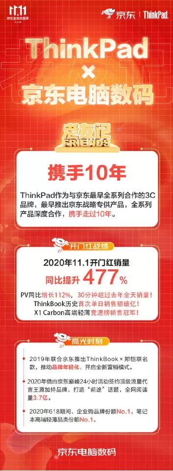 2019年,在京东海量用户画像分析的基础上,ThinkBook系列应运而生,凭借“既有颜,又能打”的产品超强性能与时尚商务形象,充分满足年轻群体的办公需求。今年京东11.11,ThinkPad在1日开门红销量同比提升477%;ThinkBook更是创下了首次单日销售额破亿的历史纪录。