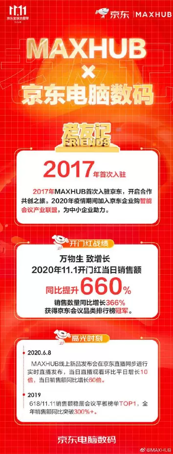 此外,京东电脑数码还通过企业购智能会议产业联盟,帮助MAXHUB对接更多联盟成员中小企业,将MAXHUB交互大屏等硬件设备,作为后者智能化远程高效办公的硬件平台。仅11月1日当天MAXHUB在京东的销售额就获得了同比增长660%的佳绩。在MAXHUB看来,是与京东十余年的合作,奠定了品牌快速实现数字化的基础,既有反向定制爆款的促进作用,更是全链路数字化优化带给企业的核心竞争力。