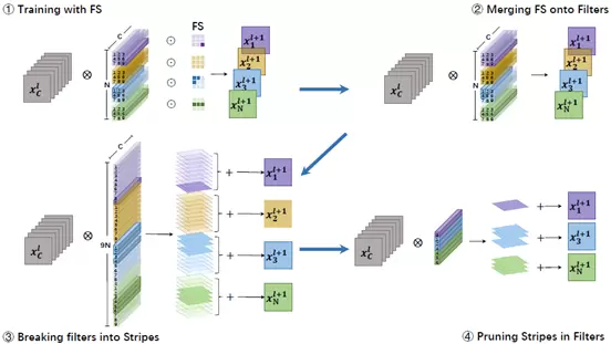 具体的,首先通过卷积计算顺序的变换,可以将滤波器从Filter wise等价变换为stripe wise(如图中③)。接下来就可以使用正常的滤波器剪枝方法对其进行裁剪(如图中④)。