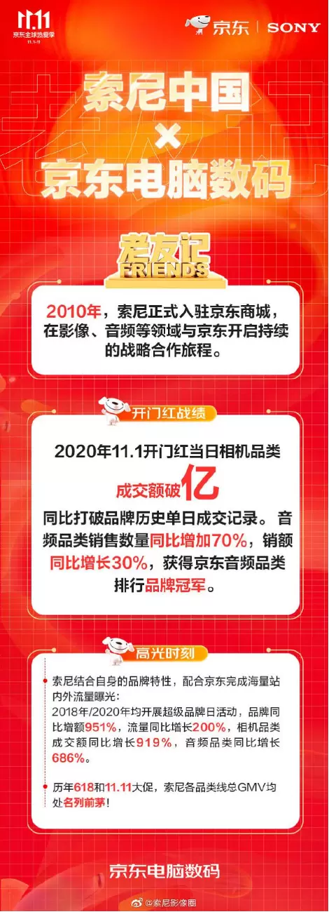 今年京东11.11,索尼旗下各细分品类包括音频、电视、全画幅微单相机的表现均相当亮眼。11月1日开门红当日,索尼相机品类成交额破亿,京东平台已成为实现索尼在今年11.11全品类快速增长的“催化剂”。