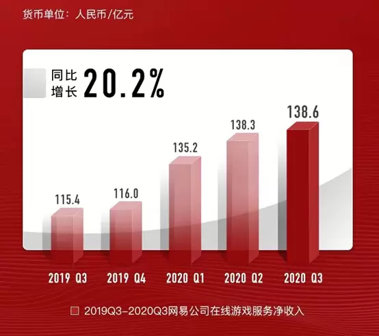 根据网易2020年第三季度的财报,网易在线游戏服务净营收为138.620亿元,上一季度和去年同期分别为138.283亿元和115.348亿元,同比增长20.2%,增速减缓。该季度,来自于手游的净营收占在线游戏服务净营收的72.7%,上一季度和去年同期该占比分别为72.3%和71.0%。