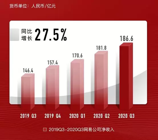11月19日,网易公司发布了2020年第三季度财报。财报显示,网易公司第三季度净收入为186.6亿元,同比增长27.5%。归属于公司股东的持续经营净利润为为29.982亿元。