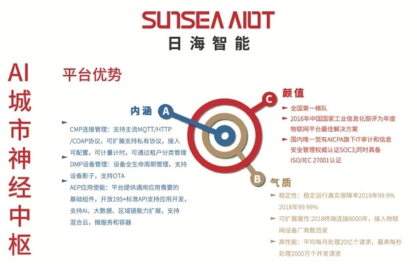 日海智能还展出了智能物联感知平台——AI城市神经中枢,日海智能物联感知平台兼具颜值、气质、内涵优势为一体,以大中台的技术理念支撑设备、数据、应用的融合贯通,融合下游各类智能终端、连接系统、共享应用,提供统一的、强有力的支撑。肉眼可见地为客户带来四大价值:一是提升可视化效率、二提升精细化管理、三提升数据化洞察、四提升智能化满意度,能够提供物联网平台中的CMP、DMP、AEP、BAP四层能力,同时能够提供设备的全生命周期管理,全面感知状态和变化,快速精准分析及决策,灵活智能指挥和调度。