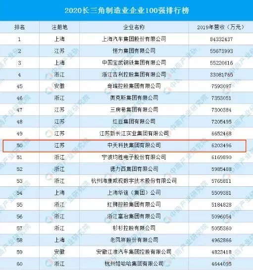 11月19日,长三角三省一市企业联合会共同发布了2020年长三角企业百强、长三角制造业企业百强系列榜单,中天科技集团蝉联两榜,荣登长三角制造业企业第50位。