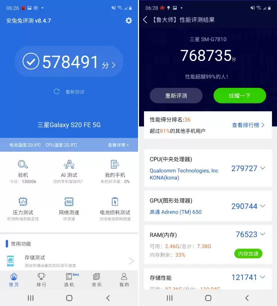 在第三方软件的实测数据中可以看到,安兔兔平台上总体评分达到了57.8万分,鲁大师平台上拥有76.8万分,性能表现超过了99%的机型,毫无疑问三星Galaxy S20 FE 5G的核心硬件处于目前安卓阵营的第一梯队,硬实力自然毋庸置疑。