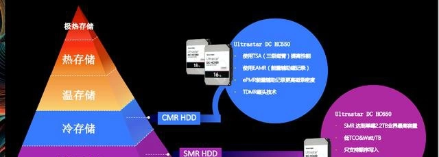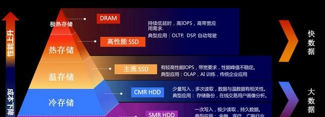 在新的存储架构模型中,数据被分为了极热存储、热存储、温存储、冷存储和极冷存储共5种类型,根据数据类型的需求特点,它们又被分为快数据、大数据,其中快数据主要借助SSD盘提供支持,而通过CMR、SMR磁盘来满足大数据,也就是海量数据的存储需求。