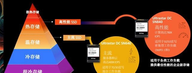 SSD盘在设计和技术被进一步细分,以西部数据Ultrastar DC NVMe固态硬盘为例,又进一步细分为SN640、SN840,其中,SN640适用于服务器和云,设计IOPS数值高达469K,适用于70%读30%写混合工作负载;相比SN840的IOPS为780K,适用于50%读50%写的工作负载,用于加速云计算以及关键业务应用的稳定运行。从SN640到 SN840,IOPS从469K到780K,表面差别并不大,但是在技术上,从NAND颗粒到控制器连接通道的数量,都有很大的差异。