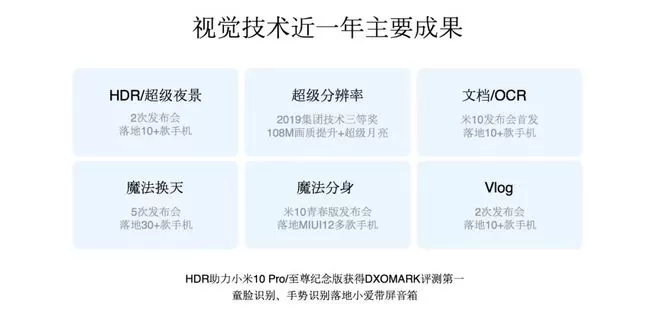 比如在计算机视觉技术方面,我们做了大量的工作,包括超级分辨率、文档模式 / OCR、魔法换天、魔法分身等。今年,我们的 HDR(高动态范围拍照)也助力小米 10 Pro / 至尊纪念版相机成功获得 DXOMARK 评测世界第一。