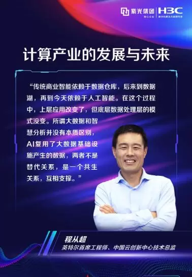 如果说数据是新时代的石油,而计算则是智能时代炼油的必要基础设施。在程从超看来,当下的大数据产业已经趋近成熟,成为了承载数字经济发展的基础设施,而新兴的人工智能也是数据处理的一种新方式。程从超指出,从数据仓库,到数据湖,再到人工智能,上层应用发生了改变,但底层数据处理层的模式没变。所谓大数据和人工智能并没有本质区别,两者不是替代关系,而是一个彼此共生,互相支撑。