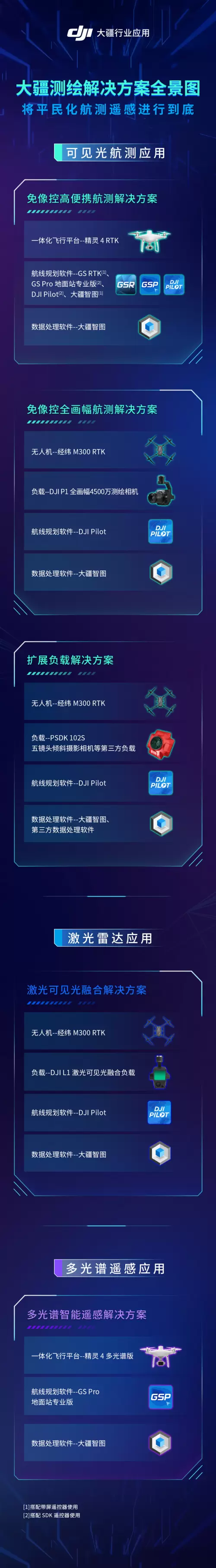 近日,大疆行业应用首次公开了测绘解决方案全景图,展示了包含可见光航测应用、激光雷达应用、多光谱遥感应用在内的全系列航测遥感解决方案。