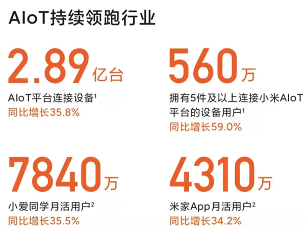 今年,雷军提出了小米未来十年的新战略,从原先的“手机+AloT”升级为“手机XAloT”。 据财报显示:小米AIoT继续保持领先地位,截至2020年9月30日,小米AIoT平台(不包括智能手机及笔记本电脑)的连接设备数达到2.89亿台,同比增长35.8%。小爱同学月活用户数达到7840万,同比增长35.5%;米家App的月活跃用戶数达到4310万,同比增长34.2%。手机和AIoT业务双双飞速增长,可见小米的"手机 X AIoT“新战略已经逐渐成型。