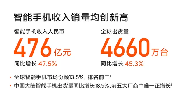 尤其值得一提的是,小米三季度智能手机销量的大幅增长。财报显示,小米智能手机收入为476亿元,同比增长47.5%,智能手机出货量4660万台,同比增长45.3%,份额达到13.5%,重回全球第三。其中,小米10系列等高端旗舰手机全球销量超过800万台,成功在全球高端旗舰市场占据了一席之地。另外,Redmi Note系列全球累计销量1.4亿台,双品牌策略大获成功。
