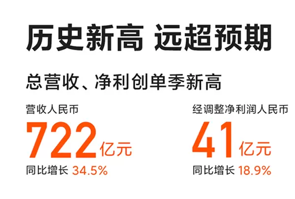 11月24日,小米集团公布了2020年第三季度财报。财报显示,小米集团三季度总收入达到人民币722亿元,同比增长34.5%;经调整净利润达到人民币41亿元,同比增长18.9%;营收、净利等多达15项业绩指标创单季历史新高,表现远超市场预期。