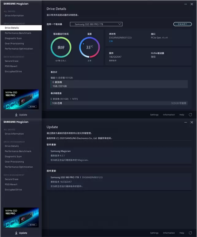 如果你想随时监测三星980PRO的运行状态,三星SSD魔术师管理软件就是个相当好用的东西。通过这个软件,用户可以方便的查看固态硬盘的型号,温度、固件、接口等关键信息,同时三星Magician还内置了性能测试软件,方便用户掌握固态硬盘产品的具体性能。