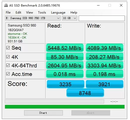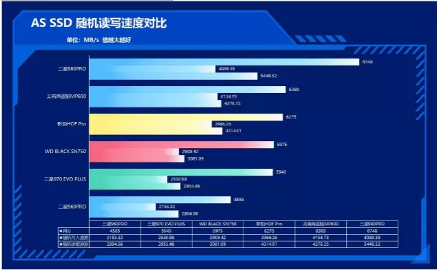 得益于PCIE4.0带宽上的升级,在AS SSD测试中,三星980PRO 1TB NVMe M.2 SSD的4K随机性能得到了很大的提升。从成绩中,我们看到最大随机读取的IOPS值达到了668917 IOPS,最大随机写入值则达到了843004 IOPS,4K随机读取达到21492 IOPS,4K随机写入达到53111 IOPS,总分达到8735,高性能看得见。