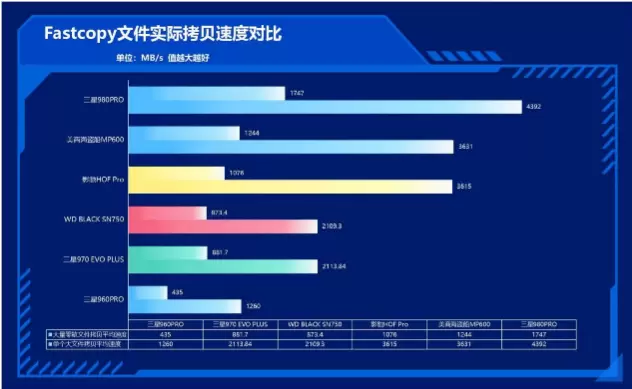 在实际拷贝测试中,在这里进行了软件测试和专业软件应用检测。在Fastcopy测试中,三星980PRO 的性能优势体现得相当明显。在拷贝单个大容量文件时,由于并未超过动态缓存容量,平均传输速度达到了4392MB/s,而写入大量零散文件时,平均速度也高达1747MB/s,相比其他PCIe 4.0 SSD的传输速度提升幅度相当大,更不用说与PCIe3.0 SSD之间的差距了。