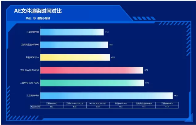在AE渲染测试中,三星980PRO的性能领先幅度更大了。仅仅渲染了13秒的视频文件,第一代PCIe4.0主控SSD与三星980PRO之间最大相差40秒,如果渲染时长更长的话,相信用户的感受是相当明显的。与PCIe 3.0 SSD之间,速度差距超过50%,充分体现了三星全新一代PCIe4.0主控的实力。