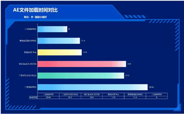 而在AE文件加载测试中,PCIe4.0 SSD与PCIe3.0 SSD时间差距很大。在整个加载过程中,因为文件并不是很大,三星980PRO的进度条几乎是刚出现就消失了;其他PCIe4.0 的表现也相当不错;但是相比PCIe3.0 SSD,进度条确实存在时间够久的。