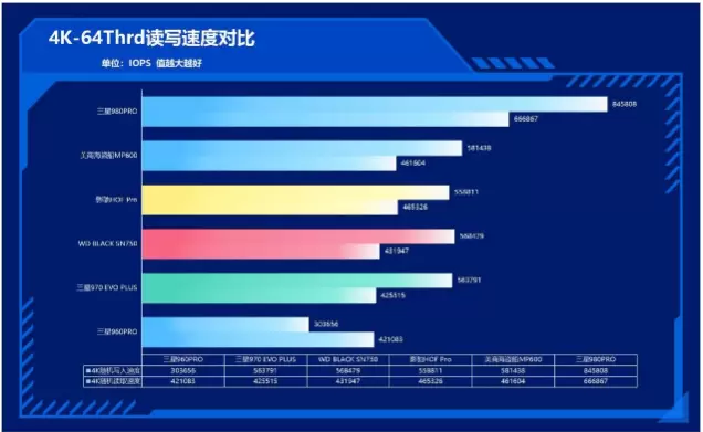 在AS SSD软件测试(10GB文件写入量设置)下,三星980PRO的4K随机性能遥遥领先。可能有人发现PCIe3.0 SSD的性能表现也相当不错,这就充分说明PCIe 4.0 X 4通道,更能让SSD的性能发挥到极致。在相同的环境下,三星980PRO 4K随机写入超过845K IOPS,相比旗舰级PCIe3.0 SSD速度提升了接近50%,相比第一代PCIe 4.0主控SSD竟也接近50%。(PS:这里可能存在测试平台的差异)4K随机读取超过666K IOPS,在PCIe3.0基础上提升了54.5%,比第一代PCIe 4.0主控性能提升了43.2%。