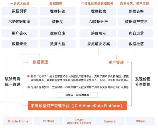 “分享智家”(JC-AiHome)是基于边缘技术和云技术的开放型家庭数据管理平台,采用PaaS模式,向下连接家庭场景及各种设备,向上提供丰富多样的应用服务,为家人、个人等提供一站式大体量数据管理和个性化的家庭数据资产服务,可匹配、打通、聚合家庭、个人客户在生活端、业务端及管理端等多端口数据源,破除数据孤岛效应和单一小体量弊端(数据引擎、P2P数据加密、用户鉴权、数据安全),搭建统一的数据管理体系(数据标签、数据湖、数据仓库、数据大脑)。同时,基于数据管理和用户管理,建立数据模型和智能应用,提炼数据价值,帮助家庭和个人创立契合自身需求的个性化数据服务中心,为家庭内部、外部之间提供数据管理到数据资产的决策、分析和交易现等智能服务。