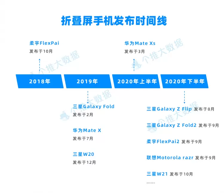 早在2018年10月,柔宇科技发布全球首款折叠屏手机——FlexPai(柔派),将折叠屏技术从概念变成现实。2019年,国内折叠屏手机概念随着三星和华为两家大厂的新品发布逐渐火爆。进入2020年,更多折叠屏手机相继问世,国内折叠屏手机细分市场初步形成。