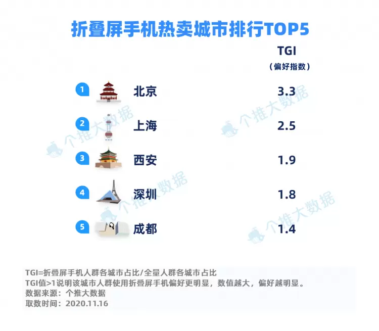 折叠屏手机在哪些城市卖得最好呢?北京、上海分别以3.3和2.5的TGI值占据前二,不愧是“国际大都市”;“古都之首”的西安排名第三,TGI为1.9;第一个经济特区“深圳”的TGI为1.8,排名第四;过着“巴适”生活的成都以1.4的TGI值排名第五。
