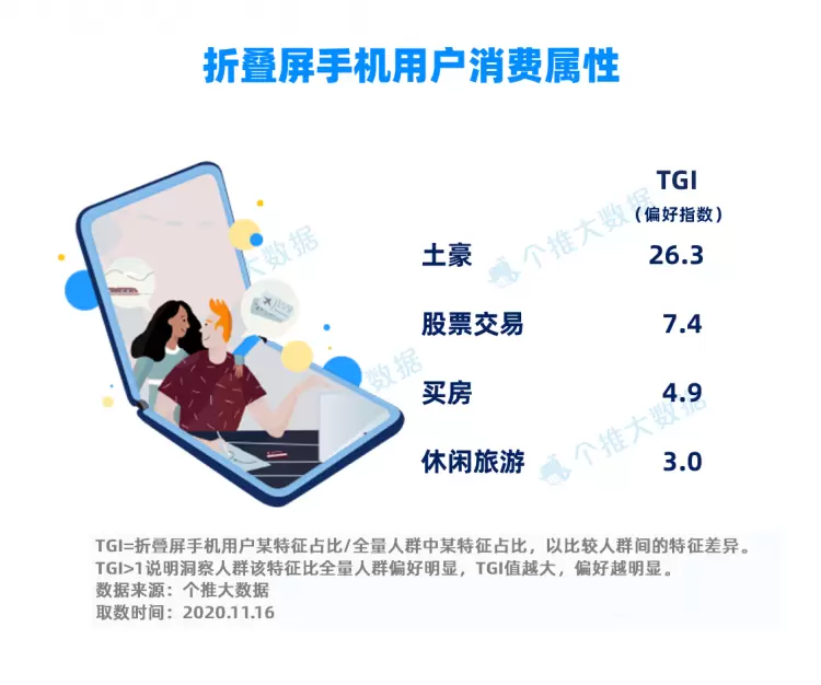 每日互动个推大数据显示,折叠屏手机用户“土豪”标签的TGI高达26.3,并且他们“买房”、“休闲旅游”这些特别“花钱”的兴趣偏好特征也是普通人的4.9倍和3.0倍,偏好明显。此外折叠屏手机用户的“股票交易”标签TGI为7.4,可以看出他们对于投资颇有兴趣。