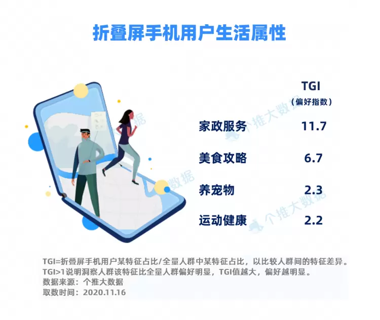 折叠屏手机用户在生活中是怎样的人?每日互动个推大数据显示,他们“家政服务”的偏好指数(TGI)达11.7,从家务中解放自我,可以用更多的时间来创造价值。他们“美食攻略”的偏好指数也高达6.7,喜欢打卡网红餐厅,尝遍大江南北的美味。此外,他们还喜欢“养宠物”,关注“运动健康”,很注重生活品质。