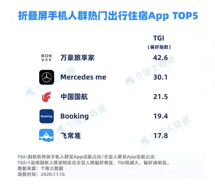 从出行偏好来看,使用折叠屏手机的“土豪们”,乘坐飞机是他们的常态,中国国航与飞常准的兴趣偏好指数达21.5和17.8,纷纷上榜。国内外的高端酒店也是他们的常光顾地,万豪旅享家和Booking分别以42.6和19.4的TGI值,排名第一和第四。梅赛德斯-奔驰专属的车联应用软件Mercedes me的TGI值达30.1,排名第二。